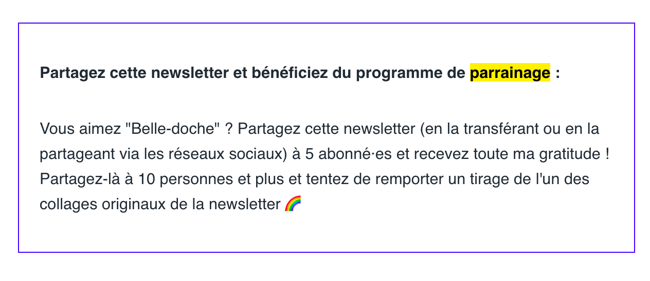 Comment cela fonctionne ? Dans la partie âParamĂštresâ de votre tableau de bord, cliquez sur âParrainageâ. Vous allez pouvoir activer, en bas de votre NL, une section incitant vos abonnĂ©.es Ă la partager Ă des personnes que cela pourrait intĂ©resser. Ceux qui lâont fait apparaĂźtront ensuite en tant que âparrainsâ dans votre tableau de brod et vous pourrez les rĂ©compenser de diverses façons. Exemple : âSi vous partagez cette newsletter Ă 10 personnes qui sâabonnent, je vous envoie mon prochain livre dĂ©dicacĂ©.â