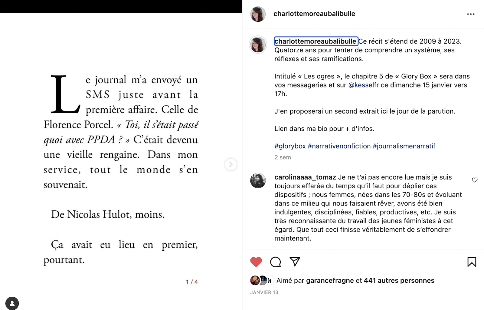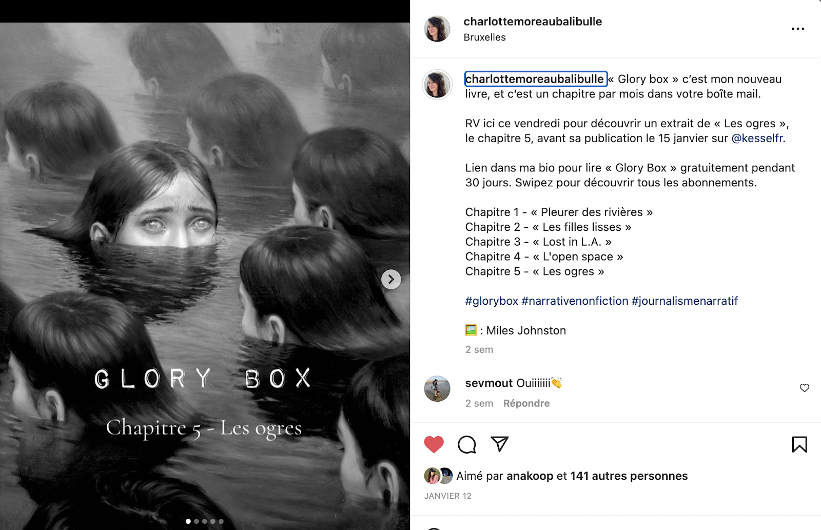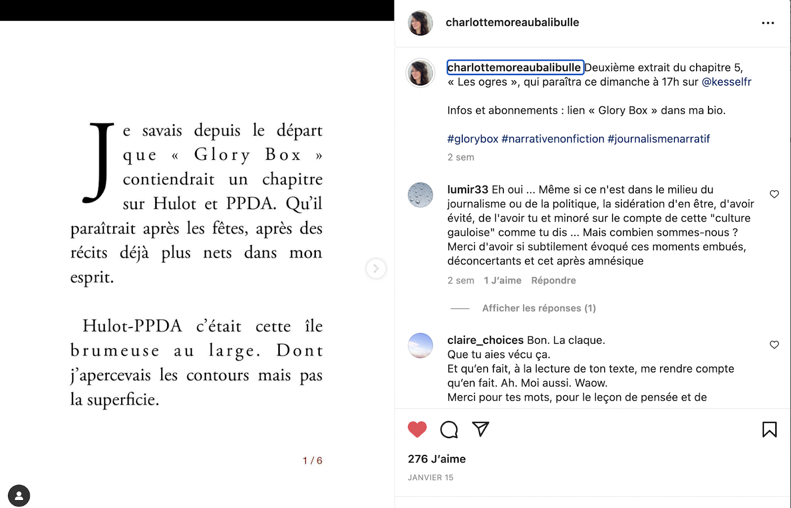 Charlotte Moreau publie en général trois posts Insta à chaque nouvel envoi de Glory Box, sa newsletter payante :