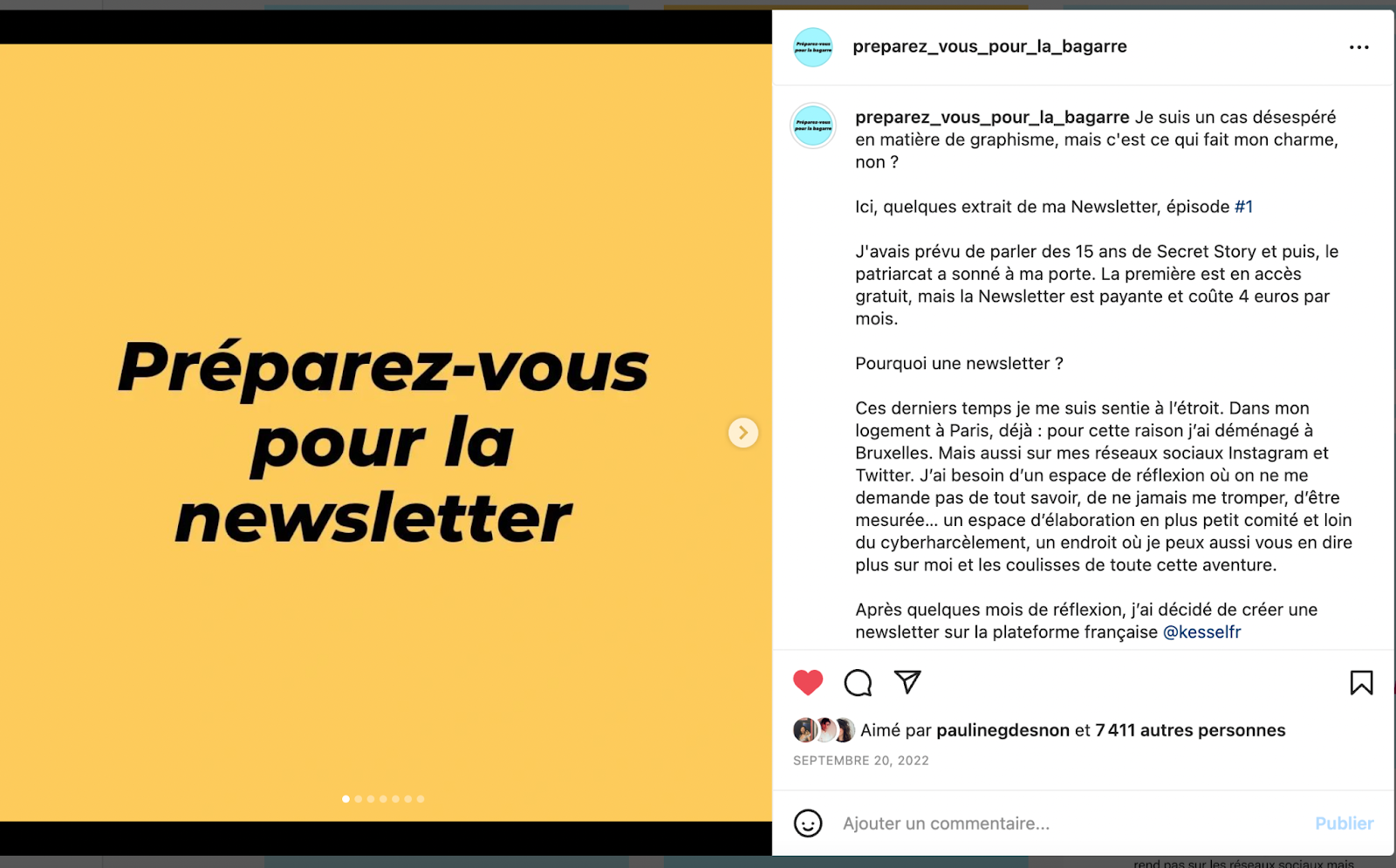 Types de publication : vous, vos sujets, la manière dont ils vous touchent, votre relation à votre newsletter, votre lien avec votre lectorat. Des carrousels, des vidéos si possible.